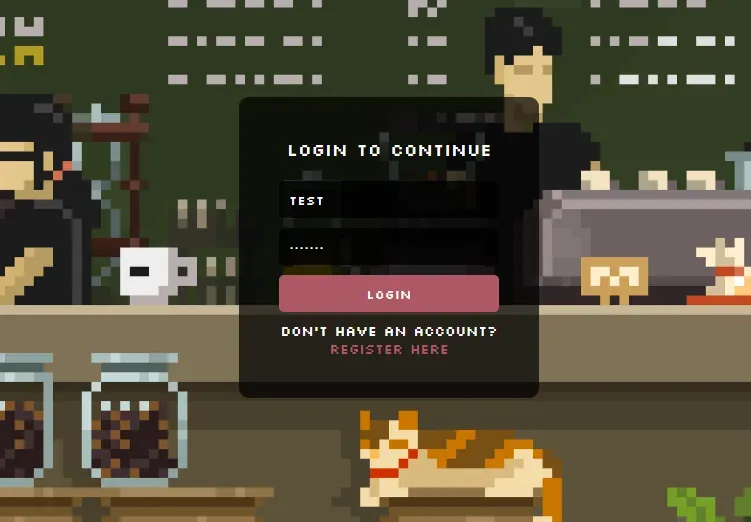 문제에서 제공하는 서버에 접속하면 픽셀 아트 풍 배경의 요리점 모습이 보인다. 기능을 이용하기 위해 로그인이 필요하므로 대충 아이디를 생성 후 로그인한다.
