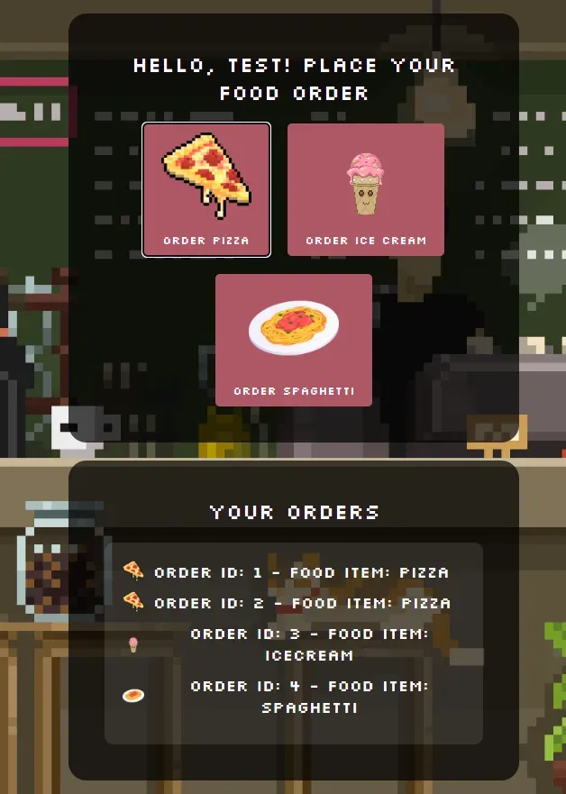 로그인하면 피자, 아이스크림, 스파게티를 주문하는 버튼이 존재한다. 클릭하면 하단에서 주문한 요리에 대한 ID가 출력된다.