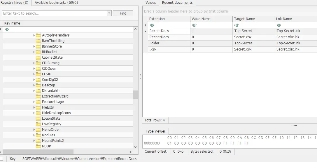 Registry Explorer 로 열어 Root\SOFTWARE\Microsoft\Windows\CurrentVersion\Explorer\RecentDocs 경로를 살펴보면 최근에 접근한 파일을 확인할 수 있다.