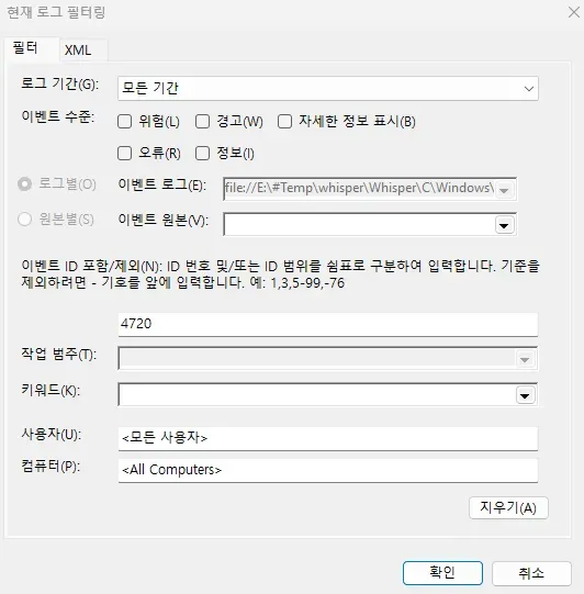 계정 생성 이벤트만 찾아야 하니 우측에서 현재 로그 필터링 버튼을 클릭, 계정 생성 이벤트 ID인 4720을 지정한다.