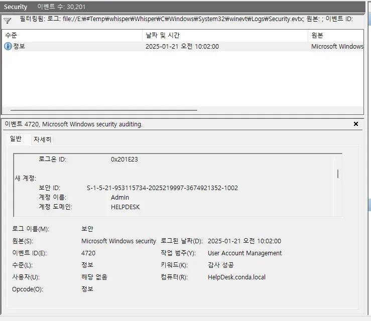 이번엔 로그인 이벤트 ID 4624를 필터링한다. 앞서 Admin 계정이 2025-01-21 오전 10:02:00 시에 생성되었으니 이후 이벤트들만 확인하면 된다. 확인 결과 Admin 계정으로 접속한 이력은 없었다.
