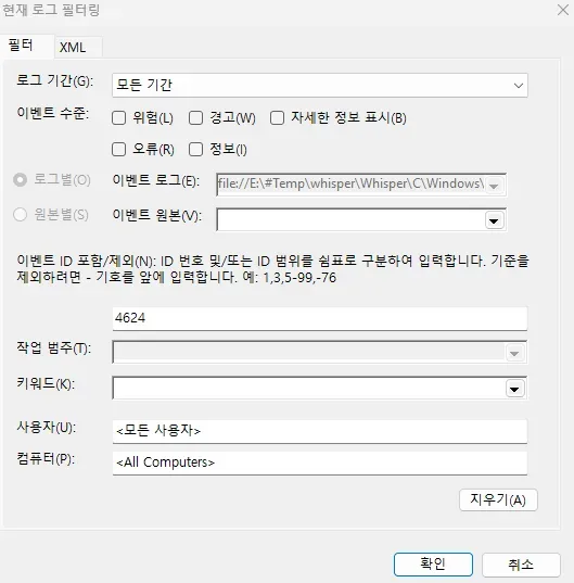 Whisper\C\Windows\System32\winevt\Logs 경로에서 Security.evtx 파일을 찾아 연다.
