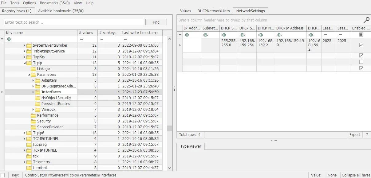 Task1 과 마찬가지로 Registry Explorer 로 Windows\System32\config\SYSTEM 를 로딩한다. Root\ControlSet001\Services\Tcpip\Parameters\Interfaces Key의 DHCPIP Address 값을 찾을 수 있다.