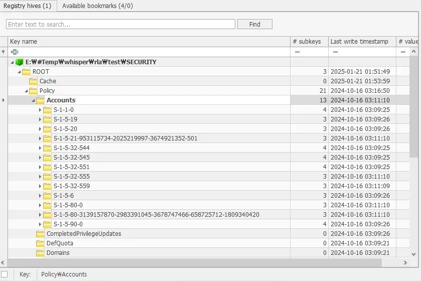 Registry Explorer 로 dirty hive를 복구한 Security 하이브를 열자. Root\Policy\Accounts 에서 여러 Key 값을 확인할 수 있다. 그 중 S-1-5-21-953115734-2025219997-3674921352-501 이 앞서 말한 유저 SID 이다. 마지막 값이 501인 것으로 보아 Guest 계정이며, 따라서 머신 SID 는 S-1-5-21-953115734-2025219997-3674921352 이다.