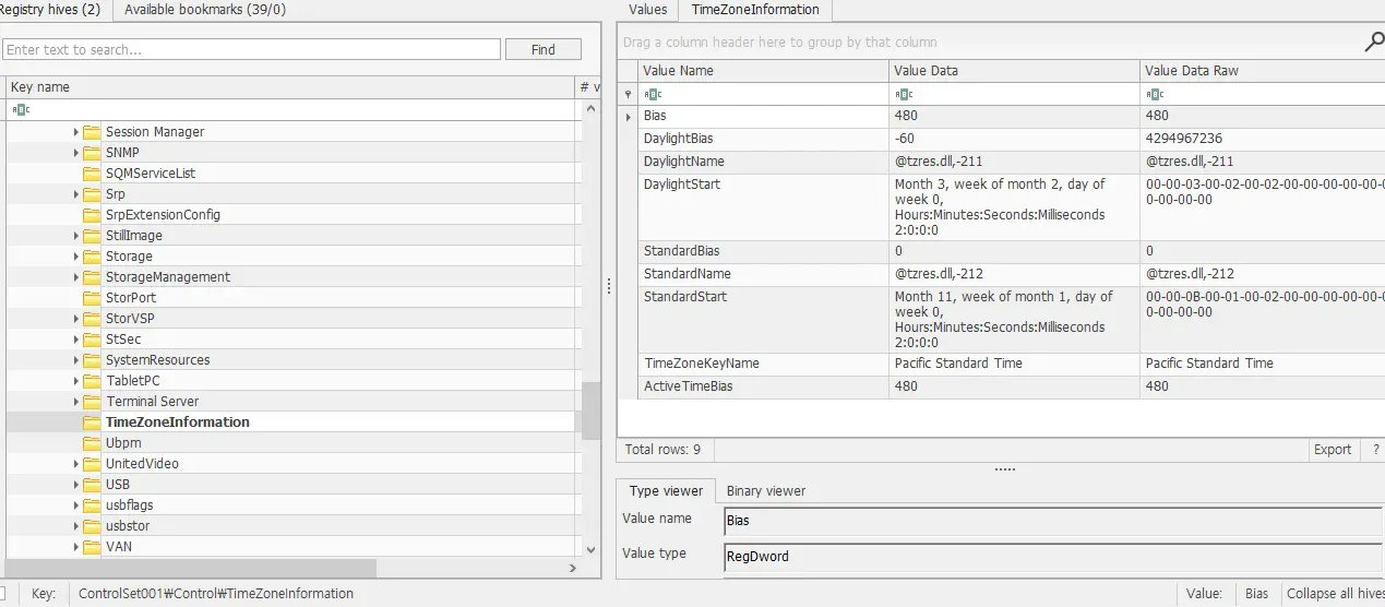 Registry Explorer 로 SYSTEM 하이브를 연다. ControlSet001\Control\TimeZoneInformation 에서 머신의 타임존을 확인할 수 있다.