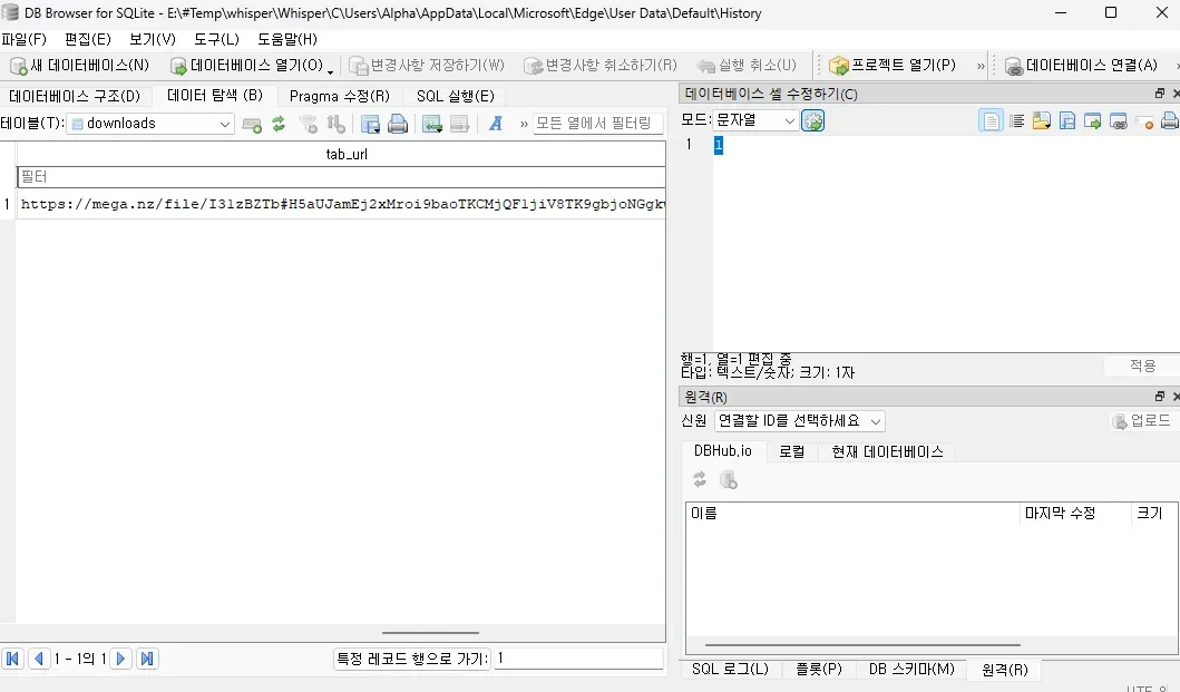 시나리오에서 Alpha 유저가 침해되었다고 명시하고 있으니 Alpha를 먼저 확인해보자. Whisper\C\Users\Alpha\AppData\Local\Microsoft\Edge\User Data\Default 경로의 History 파일은 SQL DB이며, Edge 브라우저로 사용한 흔적들이 남아 있다. 해당 파일을 SQLite Browser 로 열어 download 테이블을 살펴보니 C:\Users\Alpha\Downloads\DC-Scan.ps1 경로에 파워셸 스크립트를 다운로드한 이력이 있고, 다운로드한 URL은 https://mega.nz/file/I31zBZTb#H5aUJamEj2xMroi9baoTKCMjQF1jiV8TK9gbjoNGgkw 이다.