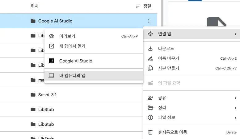 Google AI Studio 에서 생성한 채팅 파일은 기본적으로 자신의 구글 계정의 구글 드라이브에 저장된다.