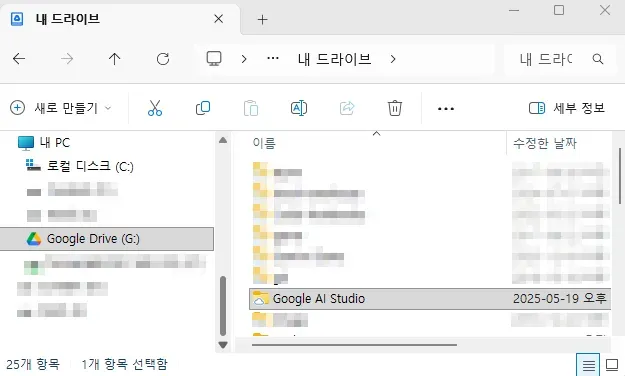 로컬 PC 의 탐색기(File Explorer)를 열어보면 좌측에 하드 디스크 사이에 Google Drive가 추가된 것을 확인할 수 있다.