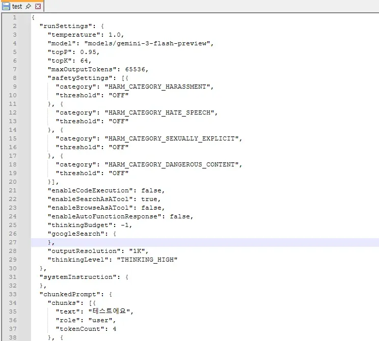 Google AI Studio 폴더에서 앞서 생성한 새 채팅 파일을 메모장으로 열어보면 해당 파일의 내용을 확인할 수 있다. 이 파일의 내용을 우리가 가져오기할 채팅 파일의 내용으로 덮어쓰고 저장하면 된다.