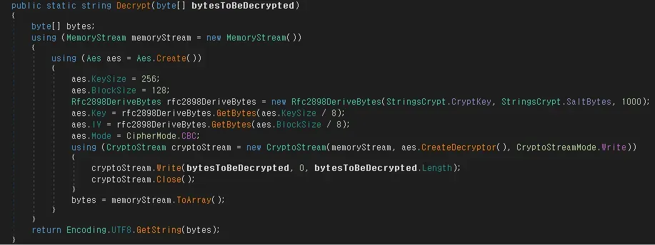 복호화 과정은 PBKDF2와 AES 알고리즘 단계로 나뉜다. PBKDF2 는 다음과 같은 하드코딩된 입력 값을 이용하여 AES 에 사용할 Key, IV 값을 생성한다.