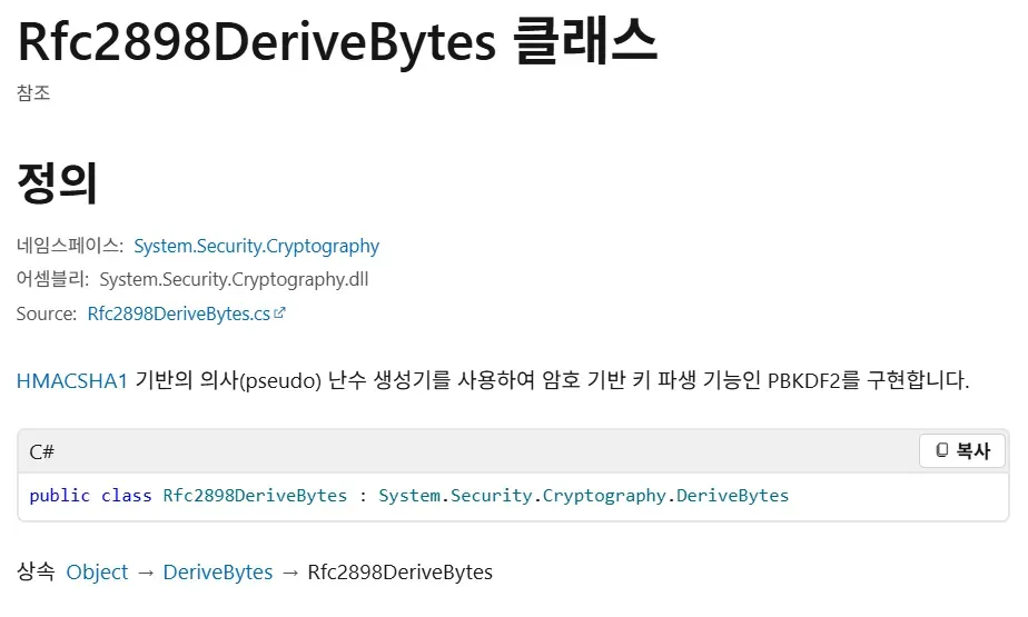 .NET 프레임워크에서는 Rfc2898DeriveBytes 클래스를 사용해 PBKDF2 알고리즘을 이용할 수 있다.