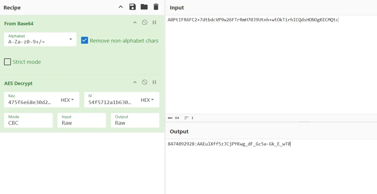 일반적으로 멀웨어에서 사용되는 암호화 방식은 하드코딩된 Key, IV 에 AES 와 같이 잘 알려진 알고리즘을 사용하는 것이다. 이런 경우 Key 와 IV 가 코드에 하드코딩되거나 런타임 도중 생성되기 때문에 Cyberchef 로 쉽게 복호화할 수 있다.