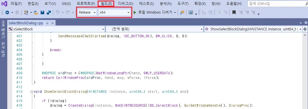 만약 빌드하는 과정에서 "'GWL_WNDPROC': 선언되지 않은 식별자입니다." 에러가 발생할 경우, 에러가 발생하는 곳을 찾아가 GWL_WNDPROC 을 GWLP_WNDPROC 로 변경한다.