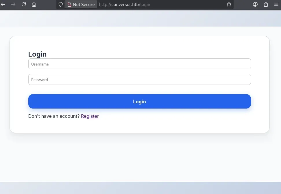 conversor.htb에 접속하면 로그인 페이지가 나타난다. 회원가입이 가능하므로 새 계정을 만들고 로그인한다.