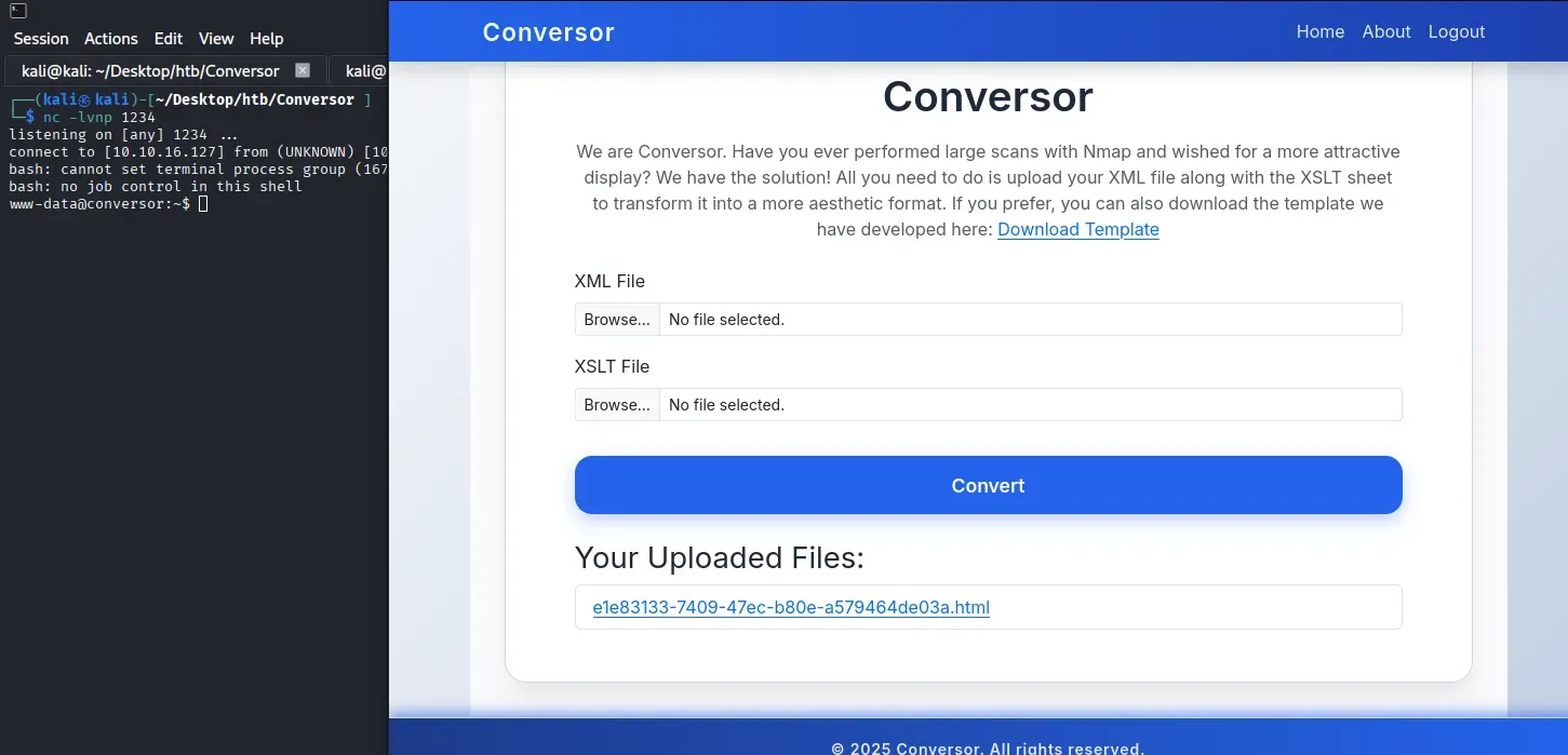 Conversor 웹 앱에서 nmap XML 파일과 함께 악성 XSLT 파일을 업로드한다.