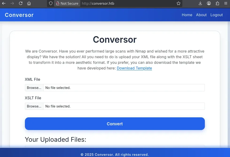 로그인하면 Conversor의 메인 기능을 볼 수 있다. XML 파일과 XSLT 스타일시트를 함께 업로드하면 XML 데이터를 시각적으로 보기 좋은 HTML 형태로 변환해주는 서비스다. Download Template 링크를 클릭하면 사이트에서 제공하는 예시 파일 nmap.xslt 을 다운로드할 수 있다.